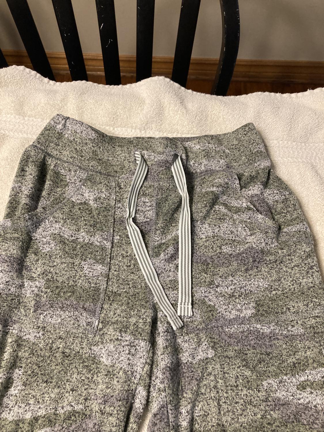Pockets and tapered, does tie around waist to make smaller if need