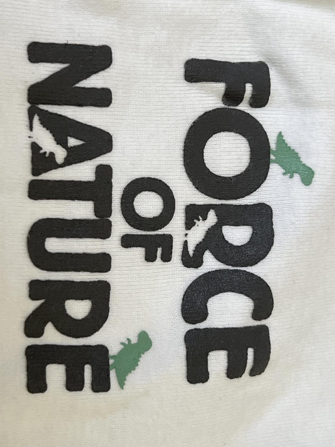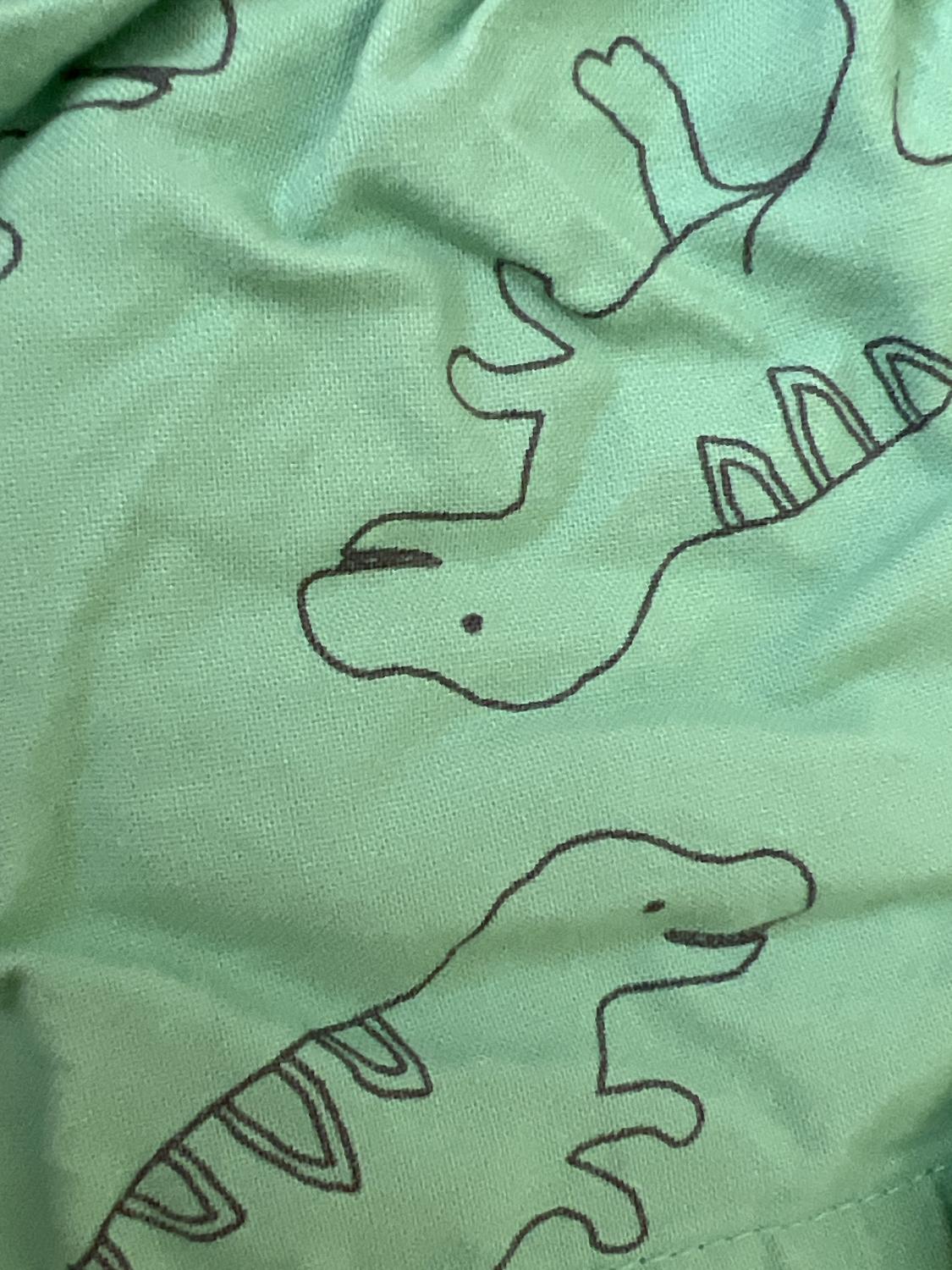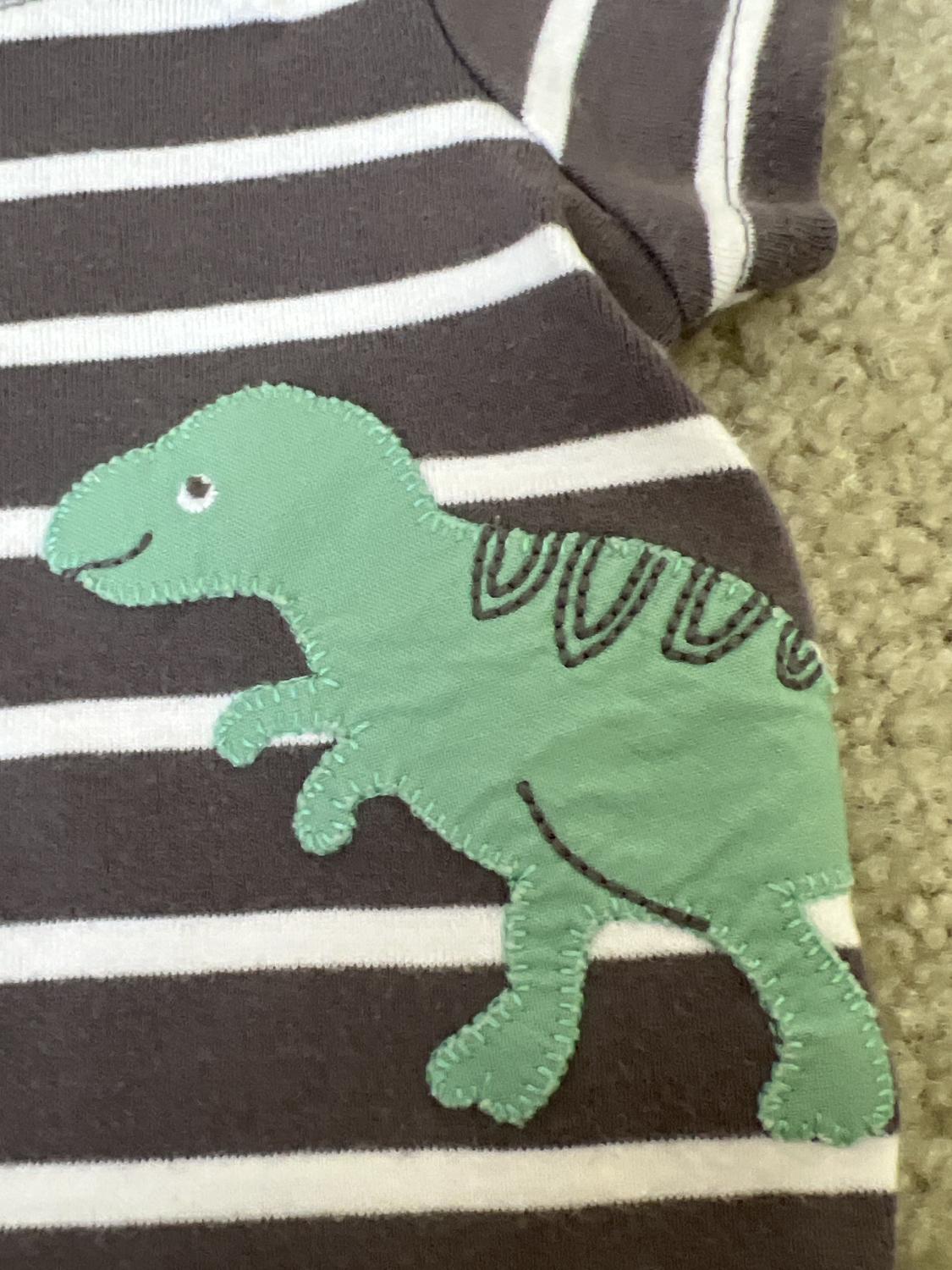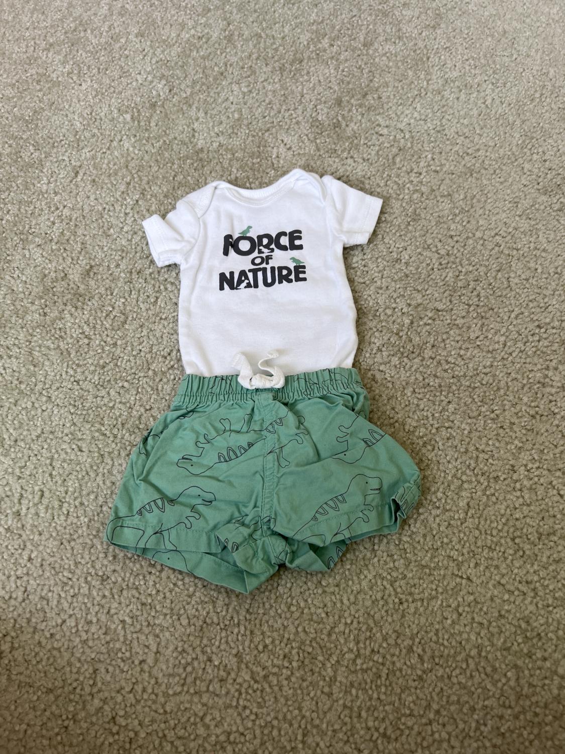 Super cute dino on tee and Dino shorts. Onesie says force of nature