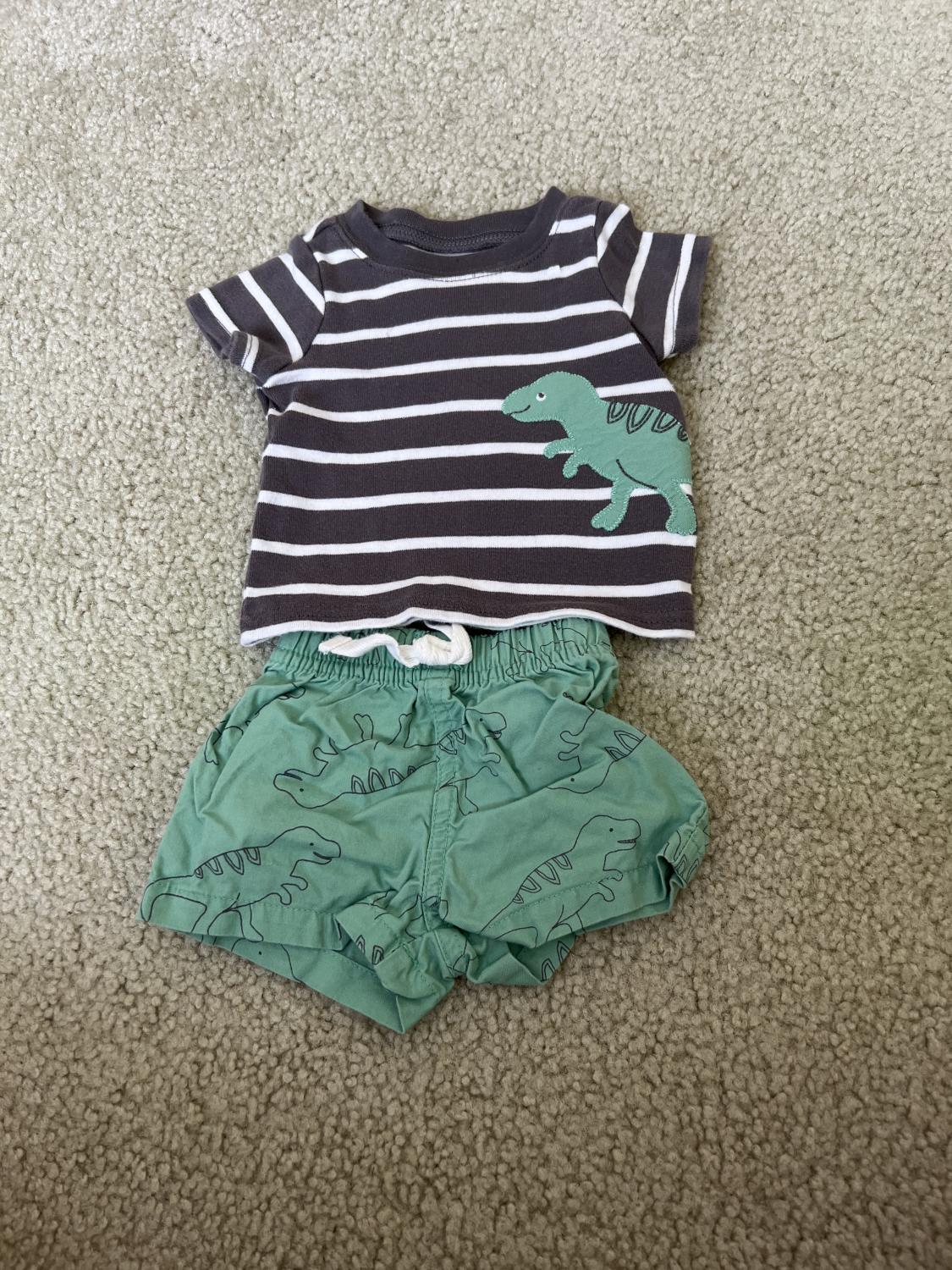 Set of 3 pieces - Carters Just One You green dino shorts, Force of nature onesie, and stripe dino tee
