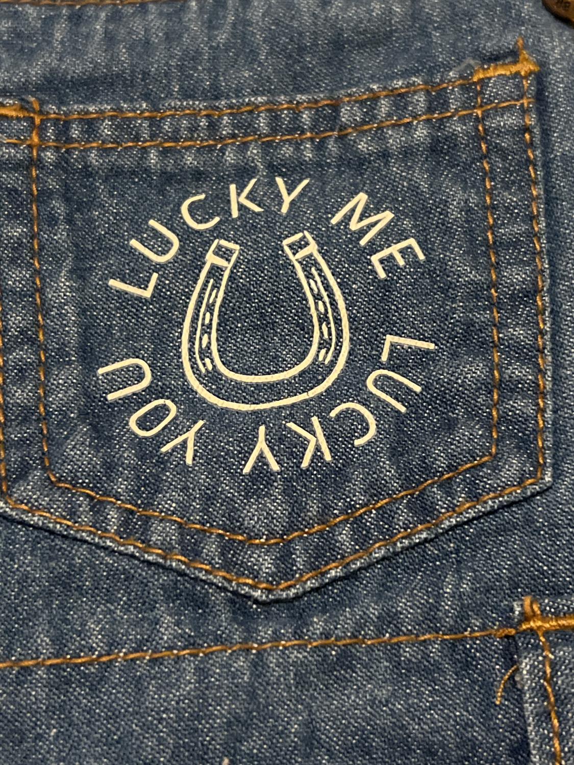 Super cute LUCKY ME, LUCKY YOU on front pocket, and embroidered LUCKY BRAND with shamrock and LB logo