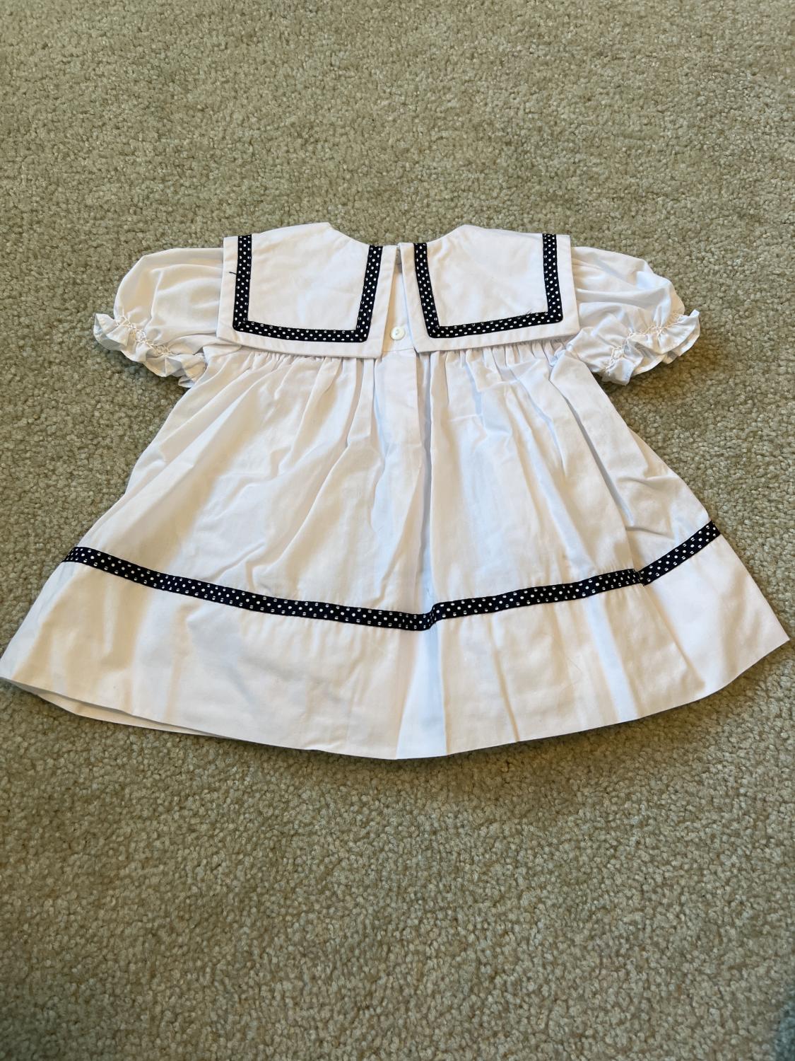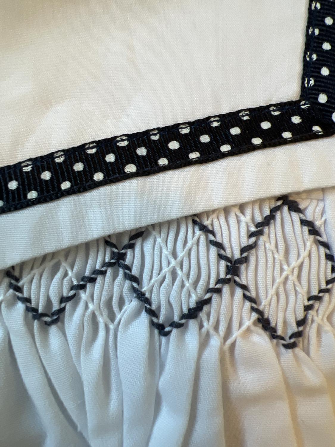 Sarah Louise- designed in England smocked white dress w/ dot trim
