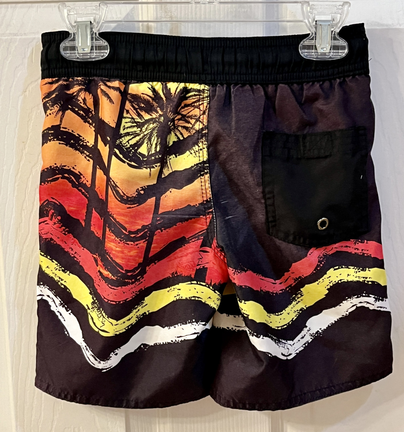 Lined, back pocket, elastic waist with drawstring, in good condition