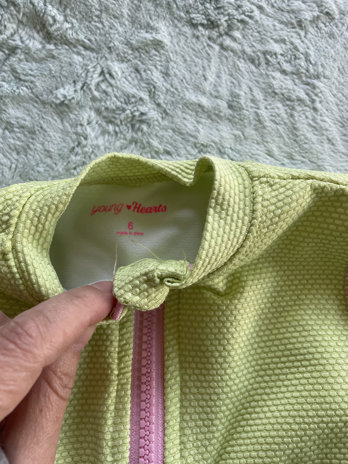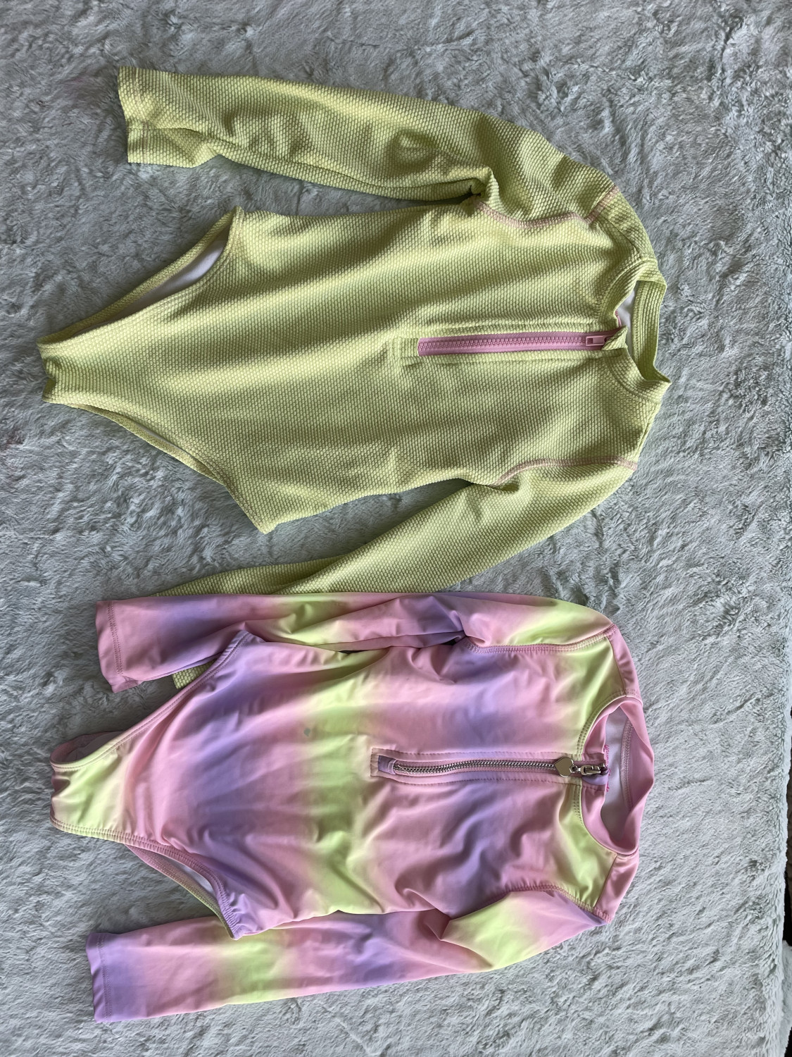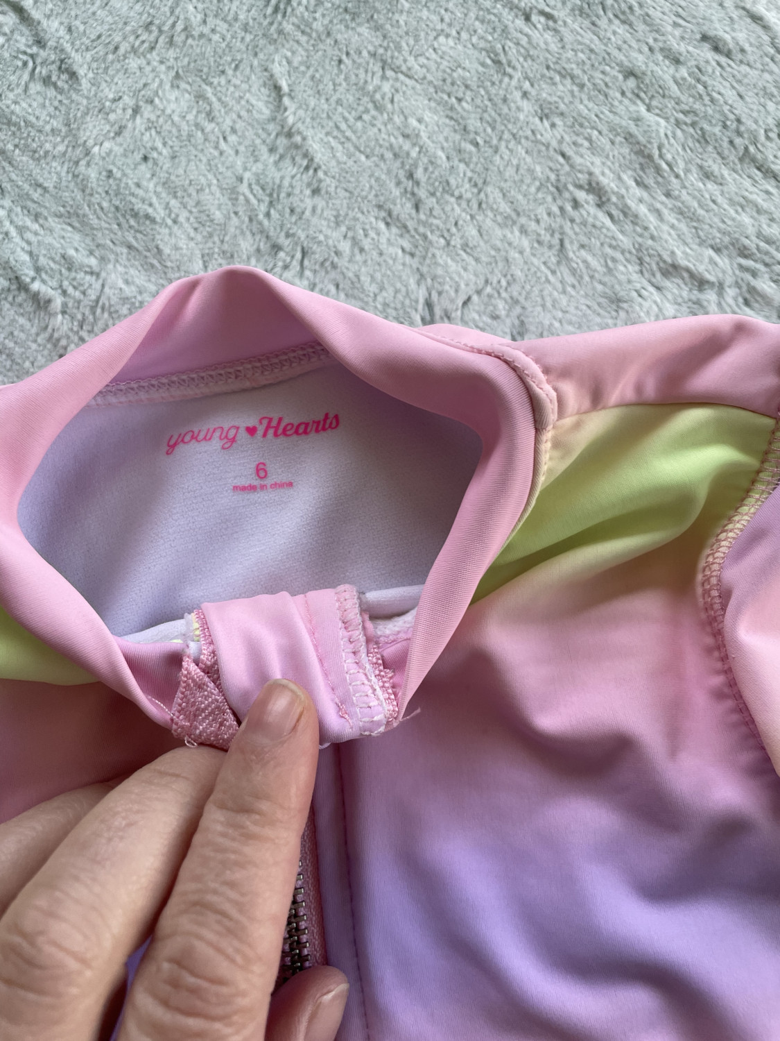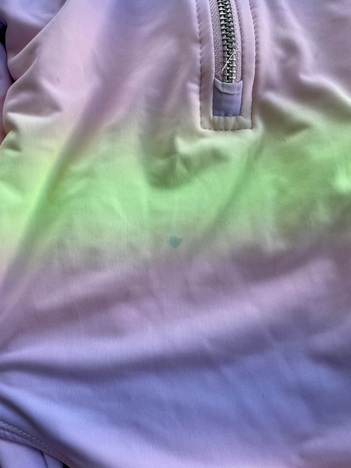 The rainbow swimsuit has a small blue marker stain on it. Shown in the picture.