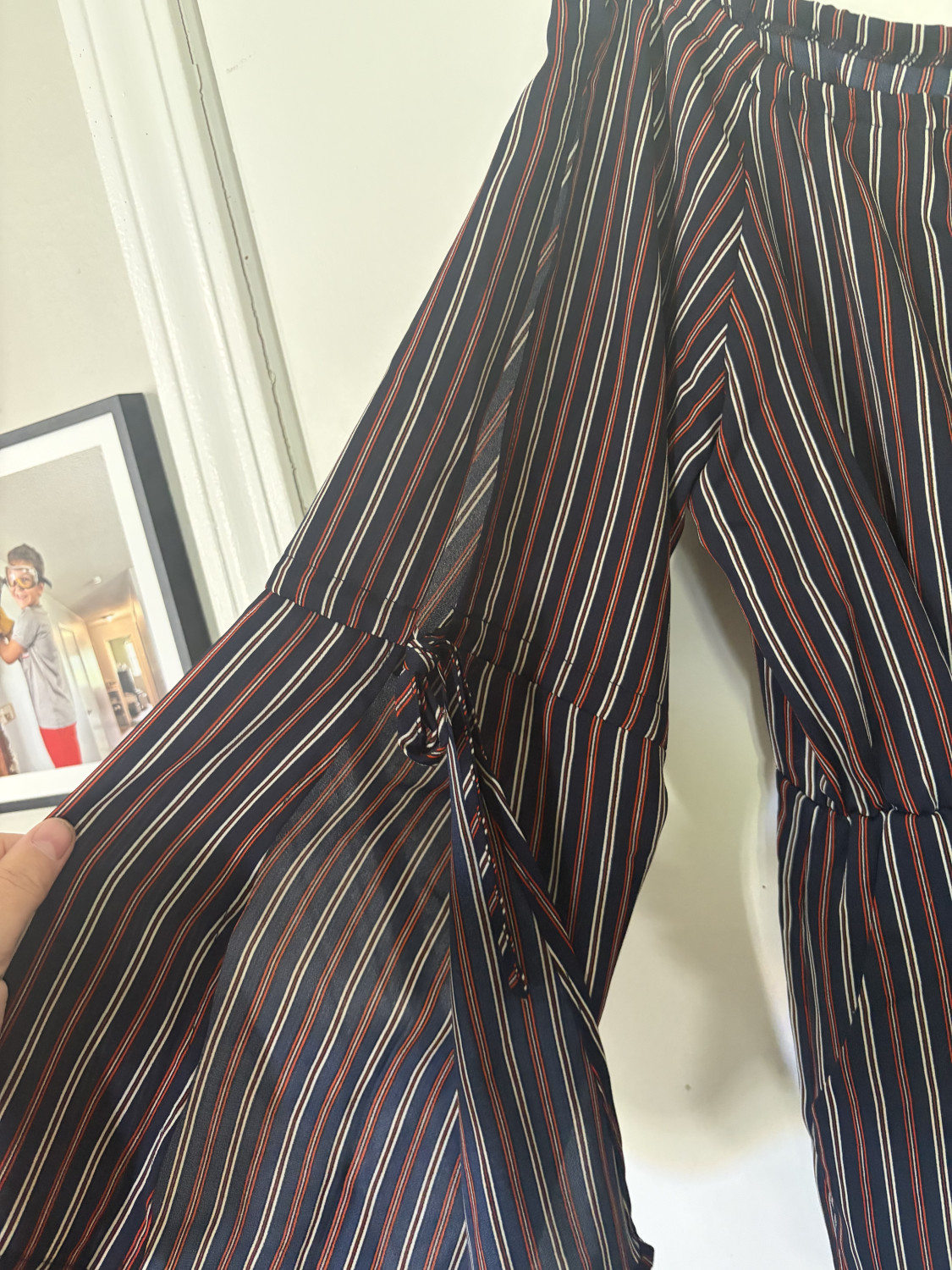 Juniors Large Striped Off-Shoulder Romper in Navy with Red & White Stripes Tote1