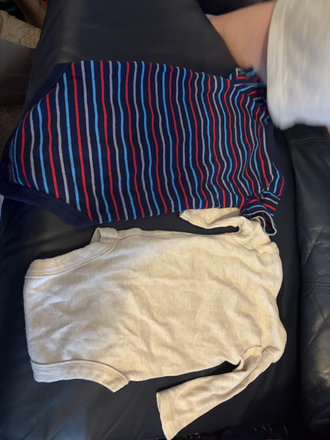 In good condition. 2 onesies size 3-6 months. 1 is striped short sleeved and 1 is long sleeved with a bear on it.