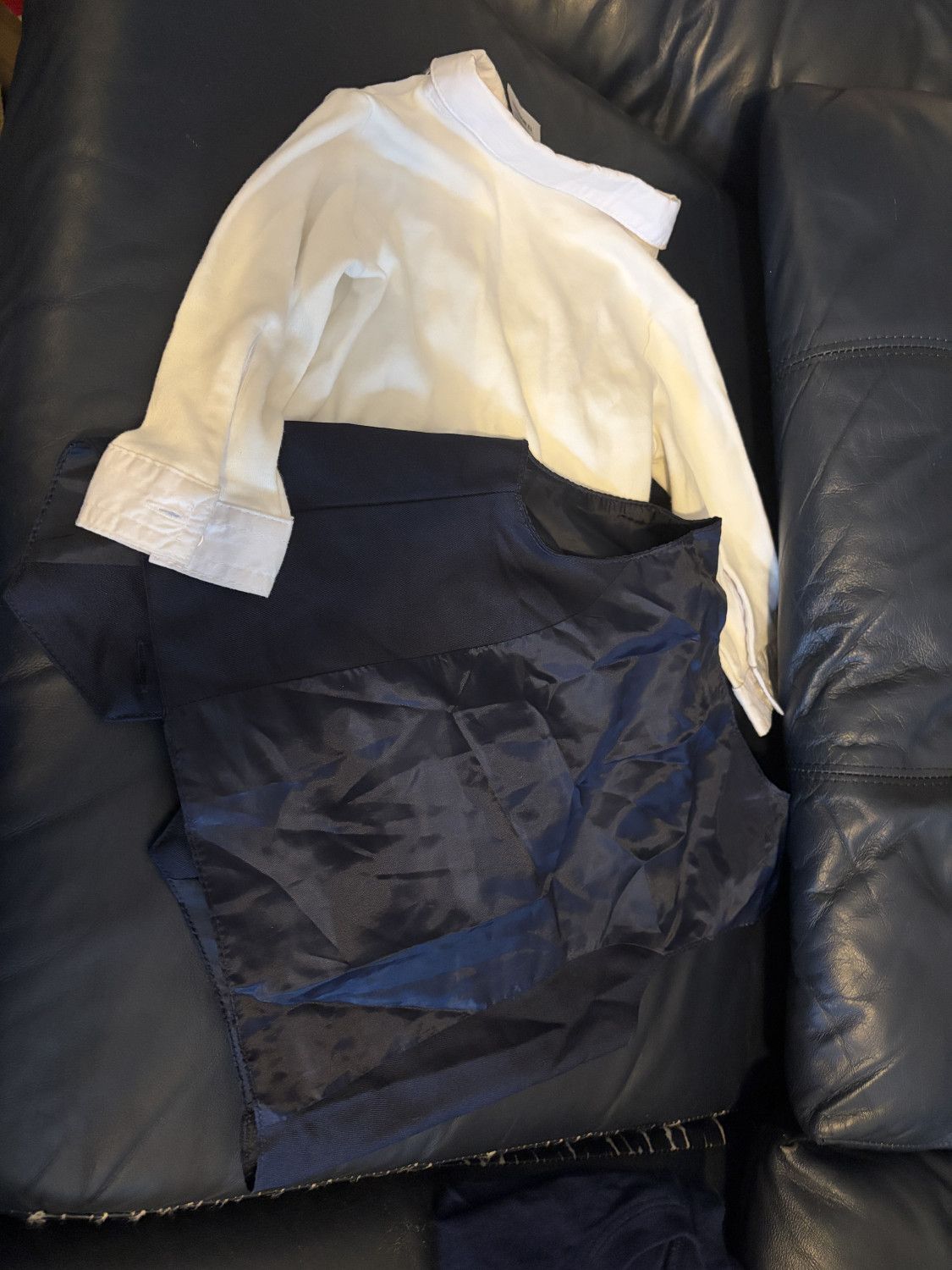 Like new. Not worn but once. Long sleeved white dress collared onesie with dark blue vest. Size 12 months.