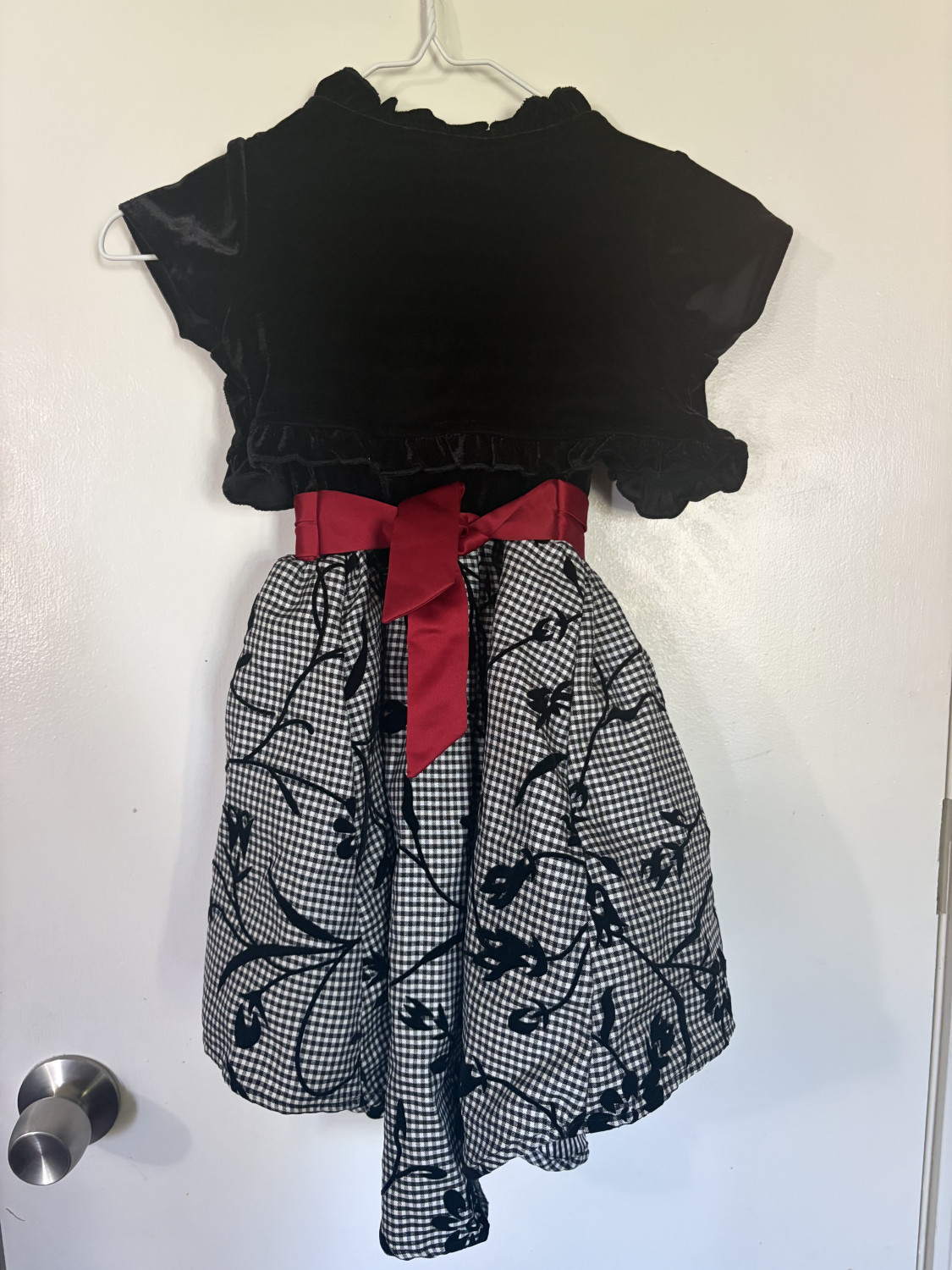 Girls 5 Black Velvet Top Red Waistband & Black Floral Gingham High-Low Bottom