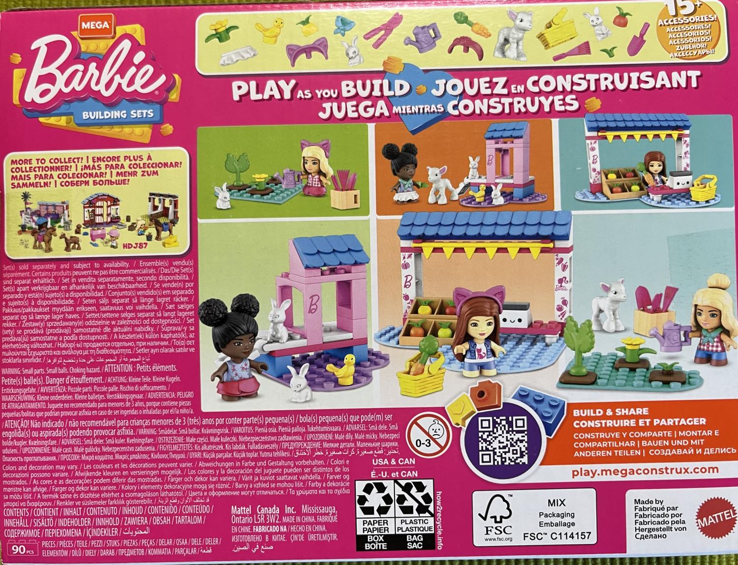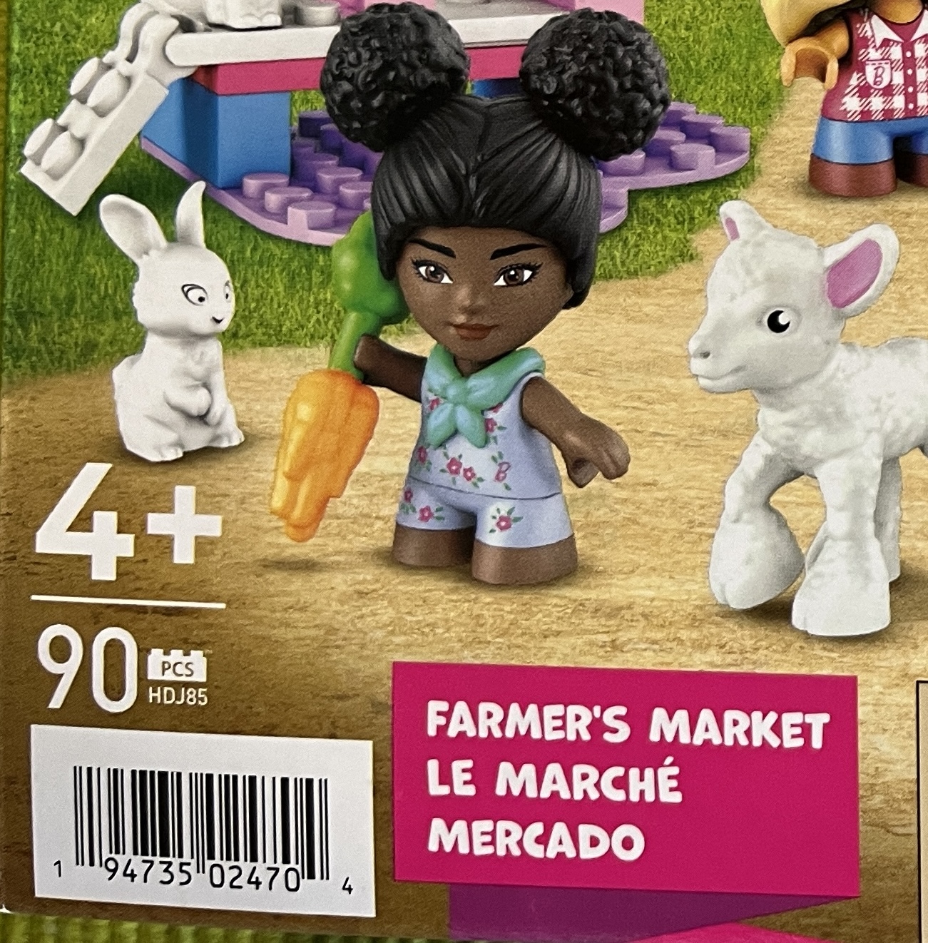 90 piece set, 3 Micro-Dolls & More. Play as you build the farmer’s market.